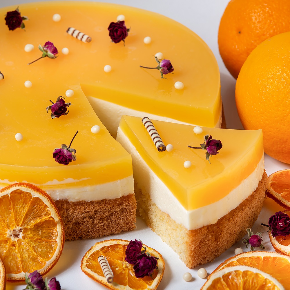 Ванільний бісквіт просочено апельсиновим сиропом. На нього вилито мус з вершків, вершкового сиру, цукру та желатину.