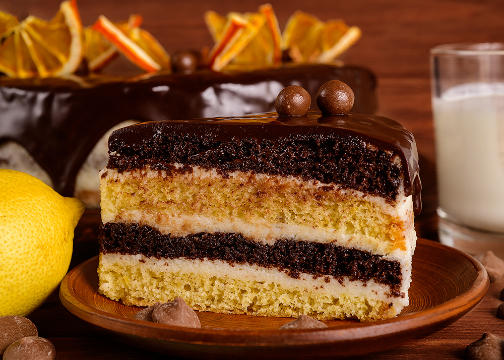 Ваш улюблений торт у малому форматі і новому оформленні. Соковиті кексові коржі на сметані - лимонний і шоколадний - перемащені масляним лимонним кремом. Даний торт - без зайвої кислинки і сподобається не тільки любителям лимонів. Декорований метеликами з сублімованих апельсинів
