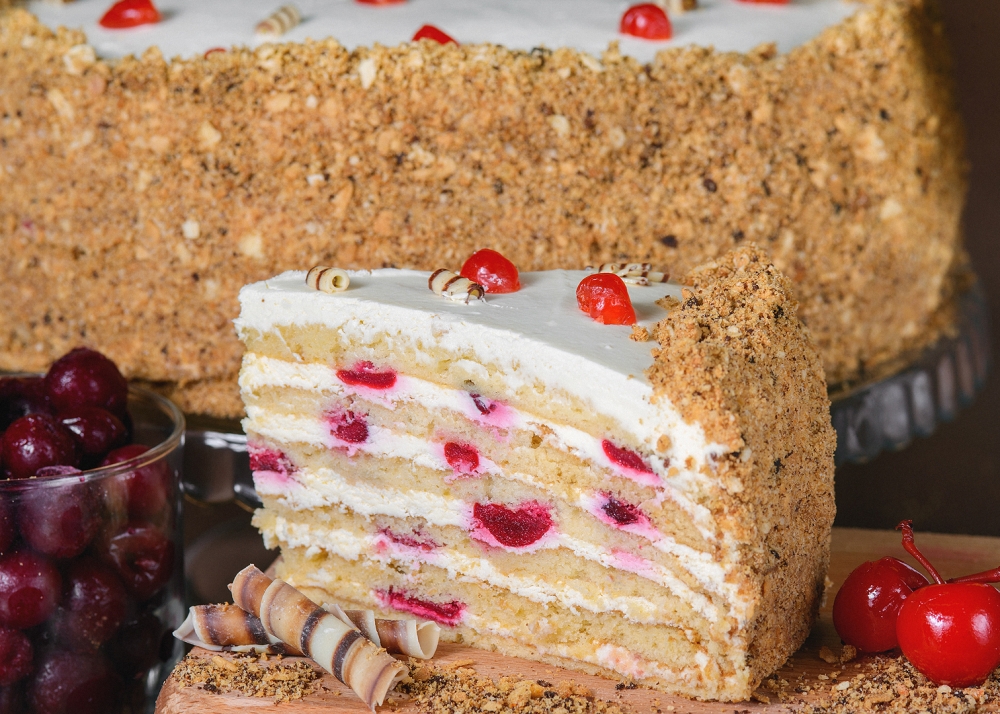 М*які бісквітні коржі з додаванням меду щедро здобрені сметанним кремом. Ми використовуємо свіжу вишню без додавання цукру чи проварювання у цукровому сиропі. Торт має дуже легку структуру, урівноважений солодко - кислий смак без вираженого запаху меду.