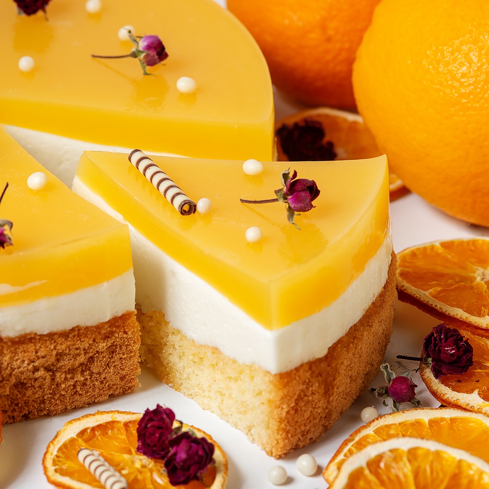 Ванільний бісквіт просочено апельсиновим сиропом. На нього вилито мус з вершків, вершкового сиру, цукру та желатину.