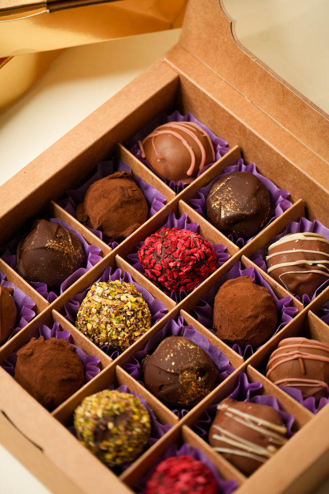 Для даного трюфеля ми настояли в ромі та зафламбували сині родзинки, додали чорний і молочний бельгійський шоколад, корицю, вершкове масло "нуазет", вершки. Трюфель має хрумку оболонку з чорного шоколаду та м'яку і ароматну серединку з цілими родзинками.